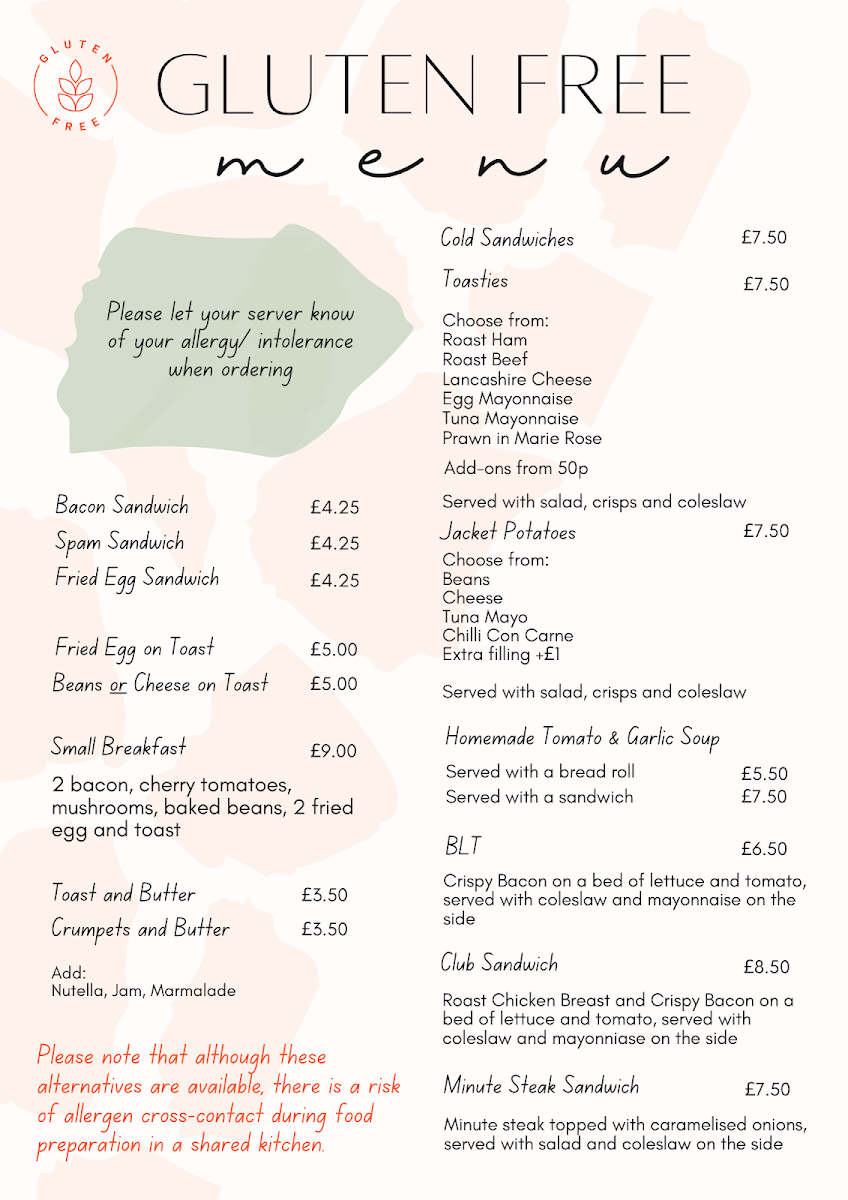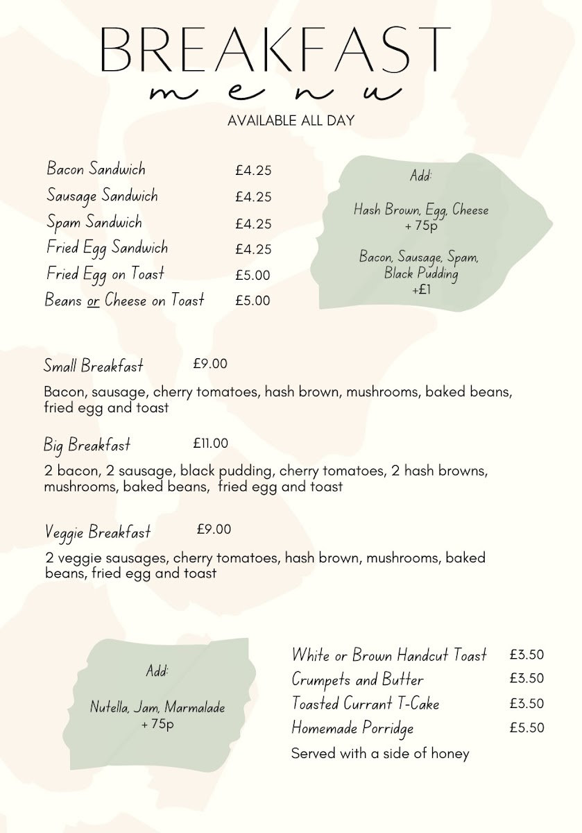 Breakfast choices include familiar favourites like Full English Breakfasts and hearty sandwiches, ideal for starting the day with something warm and filling. Throughout the day, lighter bites such as toasties, jacket potatoes, and cold sandwiches provide easy, casual meals accompanied by fresh salads and home-cooked sides like coleslaw and chips.